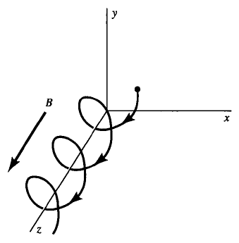 entonces, tendremos que la proyección e la trayectoria en el plano xy es un circulo de radio A centrado en el punto (a,b), y ya que en la dirección z tenemos que la aceleración es una constante, uniendo ambos movimientos, llegamos a la conclusión de que la trayectoria que toma la partícula es una hélice, el eje de la trayectoria de la bobina esta en la dirección del campo magnético, como se muestra a continuación, figura 1, de (34), al diferenciarla con respecto a t, podemos ver